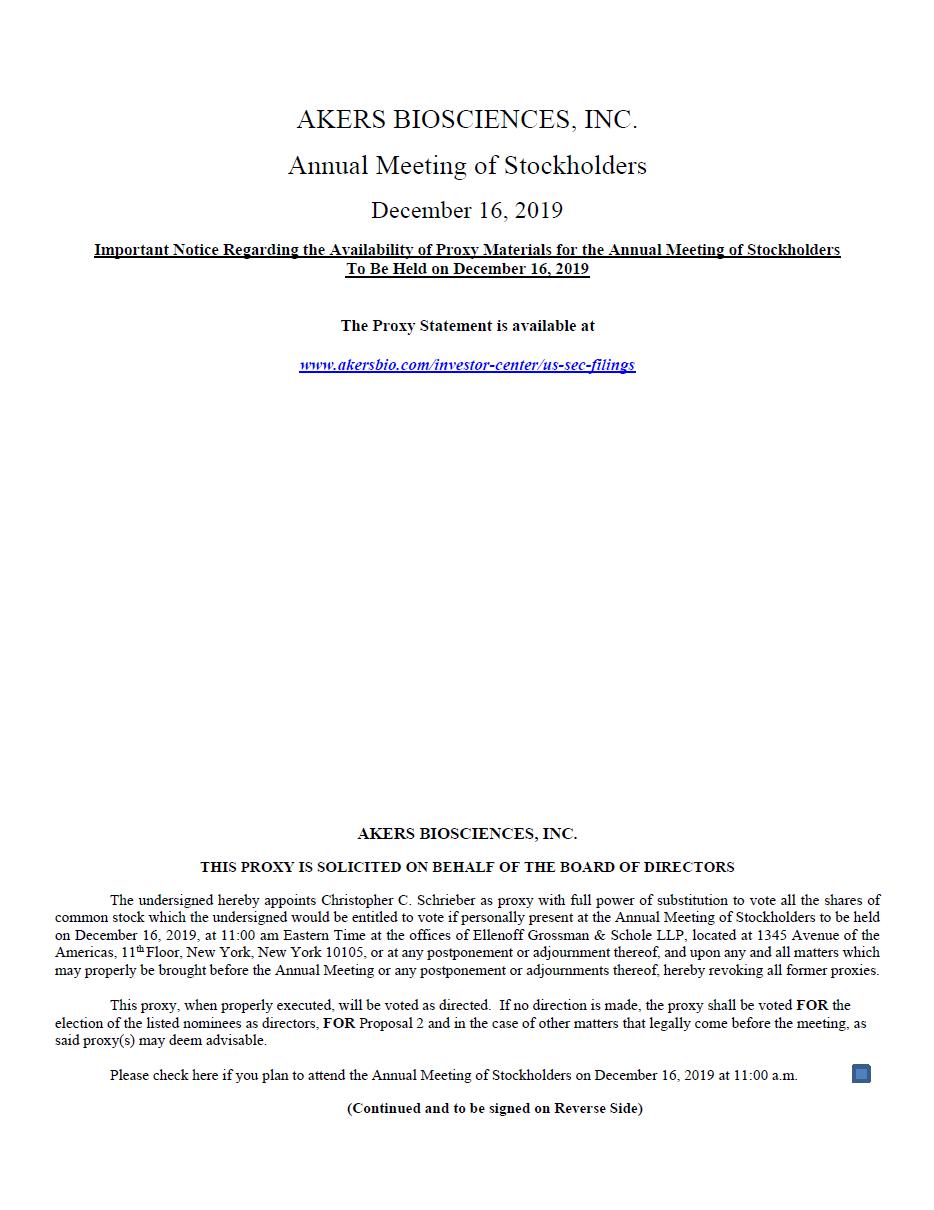 You are cordially invited to attend the 2019 Annual Meeting of Stockholders (the “Annual Meeting”) of Akers Biosciences Inc. (the “Company”), to be held on Monday, December 16, 2019, at the offices of Ellenoff Grossman & Schole LLP at 1345 6th Ave. New York, NY 10105 at 11 AM (EST), to consider and vote upon the following proposals: