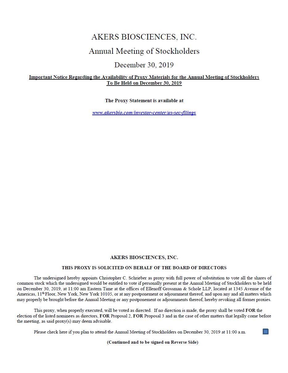 This amended notice (this “Amended Notice”) is to notify you that you are cordially invited to attend the 2019 Annual Meeting of Stockholders (the “Annual Meeting”) of Akers Biosciences Inc. (the “Company”), to be held on Monday, December 30, 2019, at the offices of Ellenoff Grossman & Schole LLP at 1345 Avenue of the Americas, New York, New York 10105 at 11:00 AM (EST), to consider and vote upon the following proposals:
