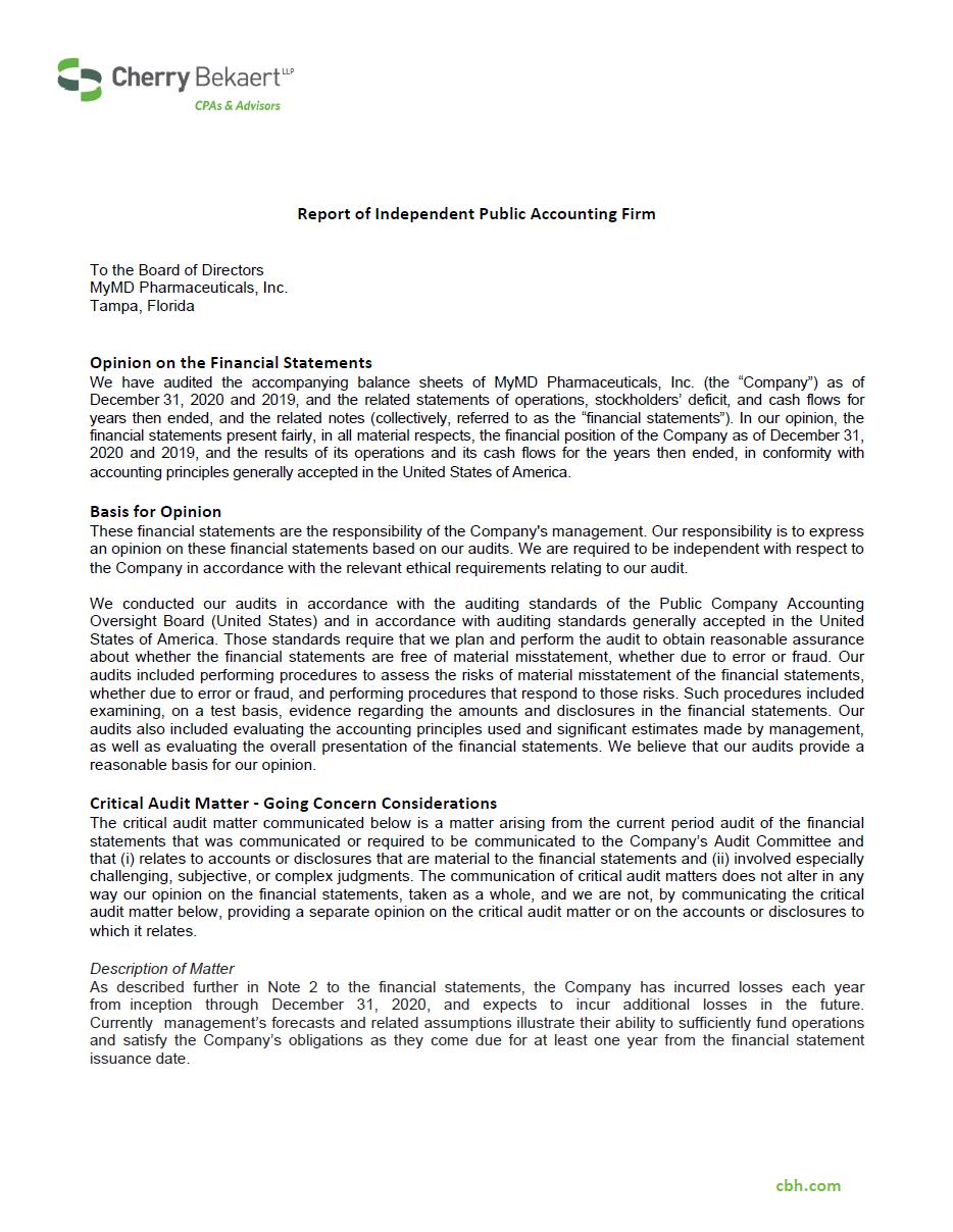 James A. McNulty, CPA Chief Executive Officer, Chief Financial Officer, Treasurer and Secretary MyMD Pharmaceuticals, Inc. 324 S. Hyde Park Ave., Suite 350 Tampa, FL 33606 Tel. (813) 864-2566 Fax (813) 527-0500 |