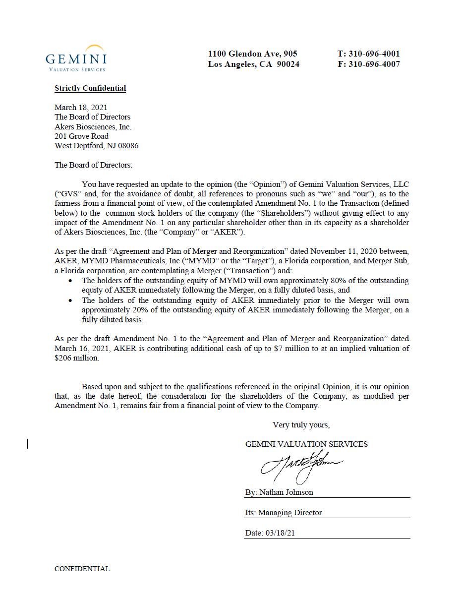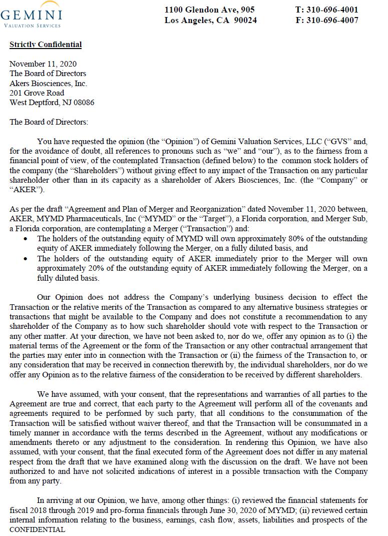 You should rely only on the information contained in this document. No one has been authorized to provide you with information that is different from that contained in this document. This document is dated March 23, 2021, and you should assume that the information in this document is accurate only as of such date. Neither the mailing nor delivery of this document to Akers stockholders or MYMD stockholders nor the issuance by Akers of shares of Akers common stock in connection with the merger will create any implication to the contrary.
