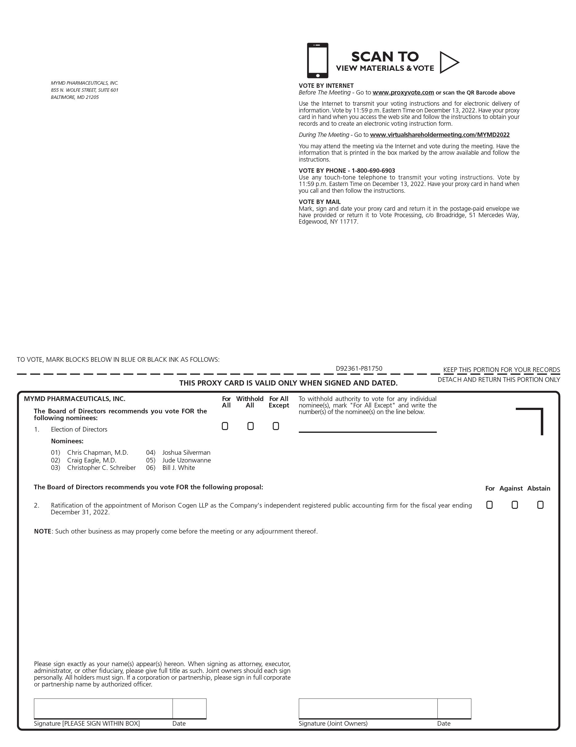 To provide access to our stockholders regardless of geographic location and assist in protecting the health and well-being of our stockholders and employees, this year’s Annual Meeting will be conducted in a virtual format only. Stockholders will not be able to attend the Annual Meeting in person; however, stockholders of record will be able to participate, vote electronically and submit questions during the live webcast of the Annual Meeting by visiting www.virtualshareholdermeeting.com/MYMD2022 and entering the 16-digit control number found on your Notice of Internet Availability or on the enclosed proxy card or voting form (if you requested paper proxy materials). If you encounter any difficulties accessing the virtual Annual Meeting, please call the technical support number available on the virtual meeting page on the morning of the Annual Meeting.