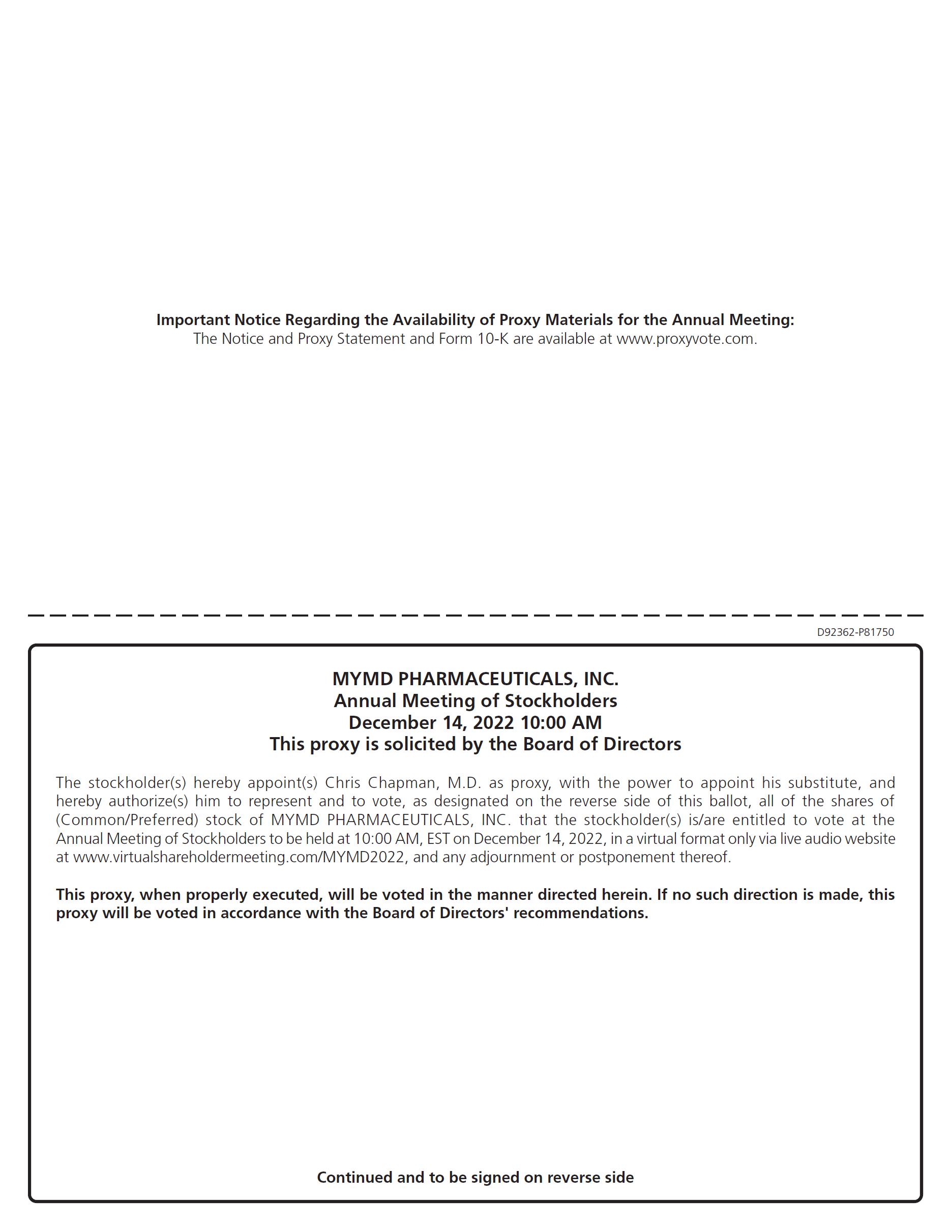 Your proxy is solicited by the Board of Directors (the “Board”) on behalf of MyMD Pharmaceuticals, Inc. to be voted at the Annual Meeting to be held on December 14, 2022, at the time and platform and for the purposes set forth in the accompanying Notice of Annual Meeting of Stockholders (the “Notice”) and at any adjournment(s) or postponement(s) of the Annual Meeting. To provide access to our stockholders regardless of geographic location and assist in protecting the health and well-being of our stockholders and employees, this year’s Annual Meeting will be conducted in a virtual format only i. Stockholders will not be able to attend the Annual Meeting in person; however, stockholders of record will be able to participate, vote electronically and submit questions during the live webcast of the Annual Meeting. We will mail to most of our stockholders a Notice of Internet Availability of Proxy Materials containing instructions on how to access our Proxy Statement and the Form 10-K and vote electronically via the Internet. This notice will also contain instructions on how to receive a paper copy of the proxy materials. All stockholders who are not sent a notice, or who otherwise request, will be sent a paper copy of the proxy materials by mail or an electronic copy of the proxy materials by email. See “About the Annual Meeting” beginning on page 2 for more information.