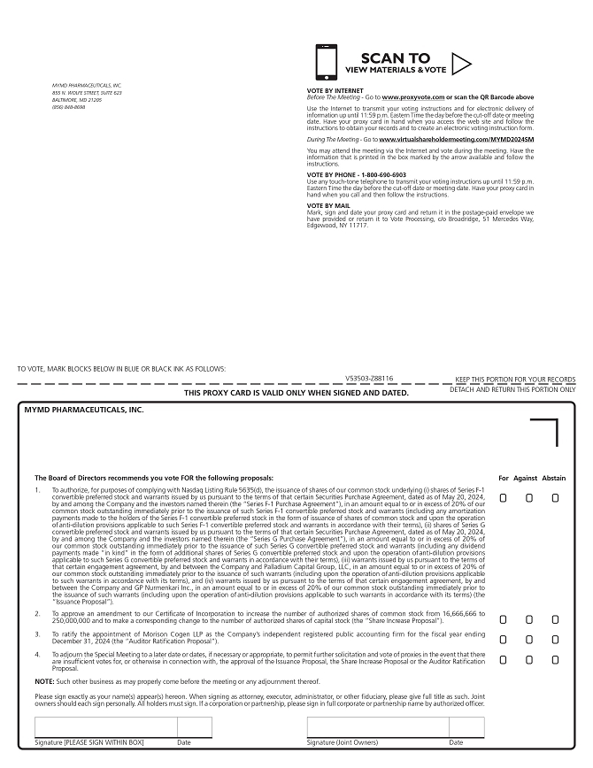 You are cordially invited to attend a special meeting (the “Special Meeting”) of the stockholders of MyMD Pharmaceuticals, Inc. (the “Company”), to be conducted in a virtual format only via live audio webcast at 10:00 a.m. Eastern Time, on Wednesday, July 24, 2024, at www.virtualshareholdermeeting.com/MYMD2024SM.