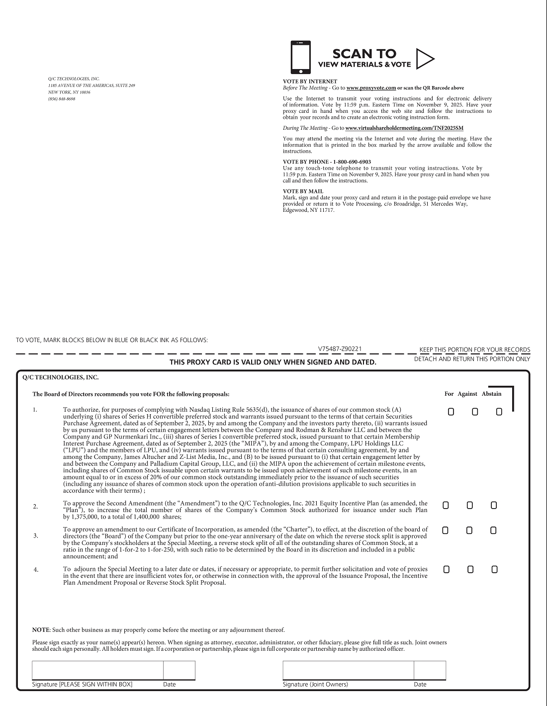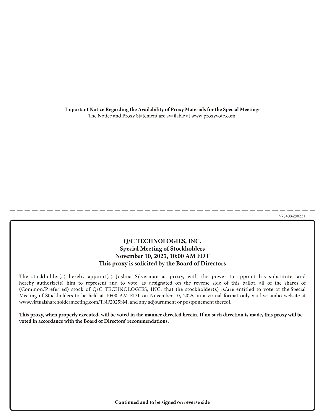 You are cordially invited to attend the 2025 Special Meeting of Stockholders of Q/C Technologies, Inc., a Delaware corporation (the “Company”), to be conducted in a virtual format only via live audio webcast at 10:00 a.m., Eastern Time, on Monday, November 10, 2025, at www.virtualshareholdermeeting.com/TNF2025SM.