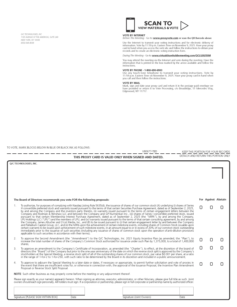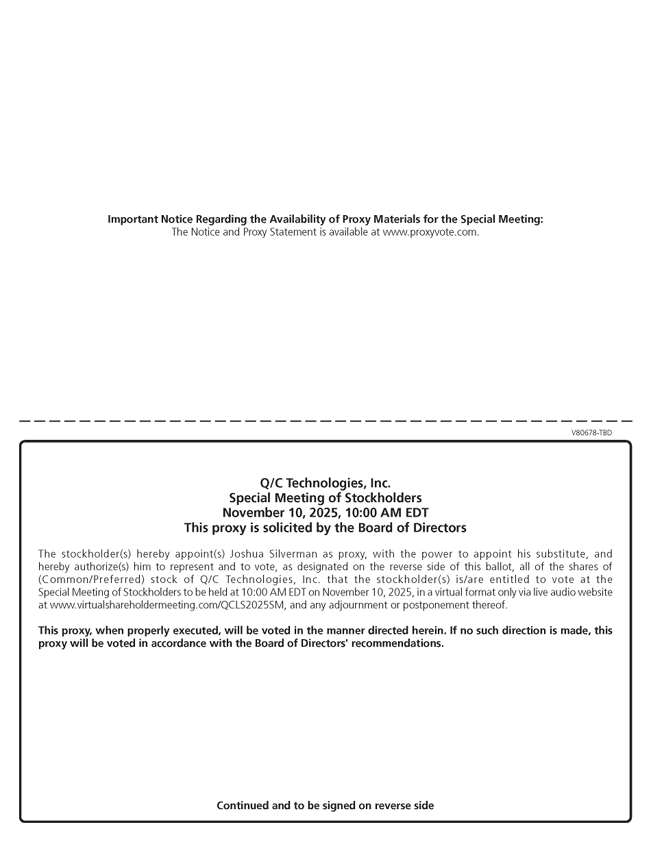 You are cordially invited to attend the 2025 Special Meeting of Stockholders of Q/C Technologies, Inc., a Delaware corporation (the “Company”), to be conducted in a virtual format only via live audio webcast at 10:00 a.m., Eastern Time, on Monday, November 10, 2025, at www.virtualshareholdermeeting.com/QCLS2025SM.